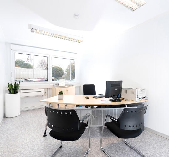 Vaccinationsrådgivning är ett viktigt steg under coronavaccinationen. Vid en sådan rådgivning krävs en skyddad, konfidentiell miljö. ELA:s konsultationsrum är idealiska för sådana situationer: stora fönster släpper in naturligt ljus, samtidigt som insynsskyddande film förhindrar att personer utanför tittar in. Den komplexa layouten av modulväggarna, som tillverkas av isolerade sandwichpaneler, skapar både en behaglig temperatur och avskildhet för rådgivning.