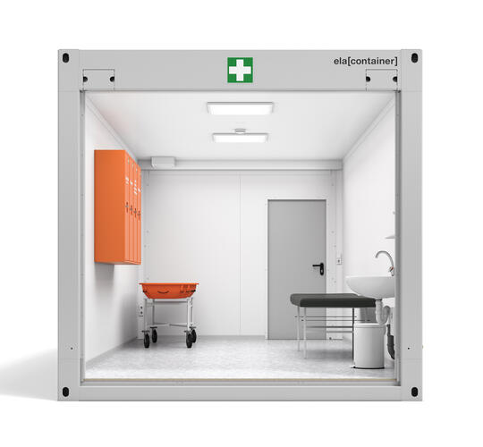 Nödsituationer kan även uppstå på en coronavaccinationscentral, och därför är det så viktigt att redan i planeringsfasen tänka på lämpliga utrymmen för att ge patienterna första hjälpen - optimalt på en plats nära behandlingsrummen eller väntrummen. ELA:s första hjälpen-moduler kan enkelt och smidigt integreras med det mobila vaccinationscentret som en Allround kvalitetsmodul eller en Premium modul. Sanitetsmodulerna levereras med den viktigaste utrustningen för att kunna agera vid nödfall, inklusive ett låsbart medicinskåp, en sopkorg, en undersökningsbrits och insynsskyddande fönster med rulljalusier.