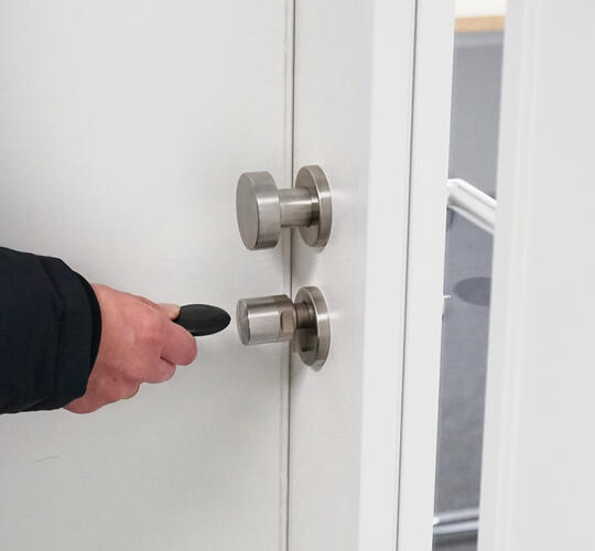 Viktiga utrymmen på vaccinationscentralen ska hållas låsta och endast vara tillgängliga för behöriga personer. Detta gäller särskilt förvaring av vacciner. På begäran kan ELA installera elektroniska lås som styrs med en transponder, för att minimera kontakten vid tillträde till rummen och maximera säkerheten. Med en transponder kan användare ges behörighet att använda det elektroniska låset eller blockeras, och interaktion med dörrlås kan övervakas externt.